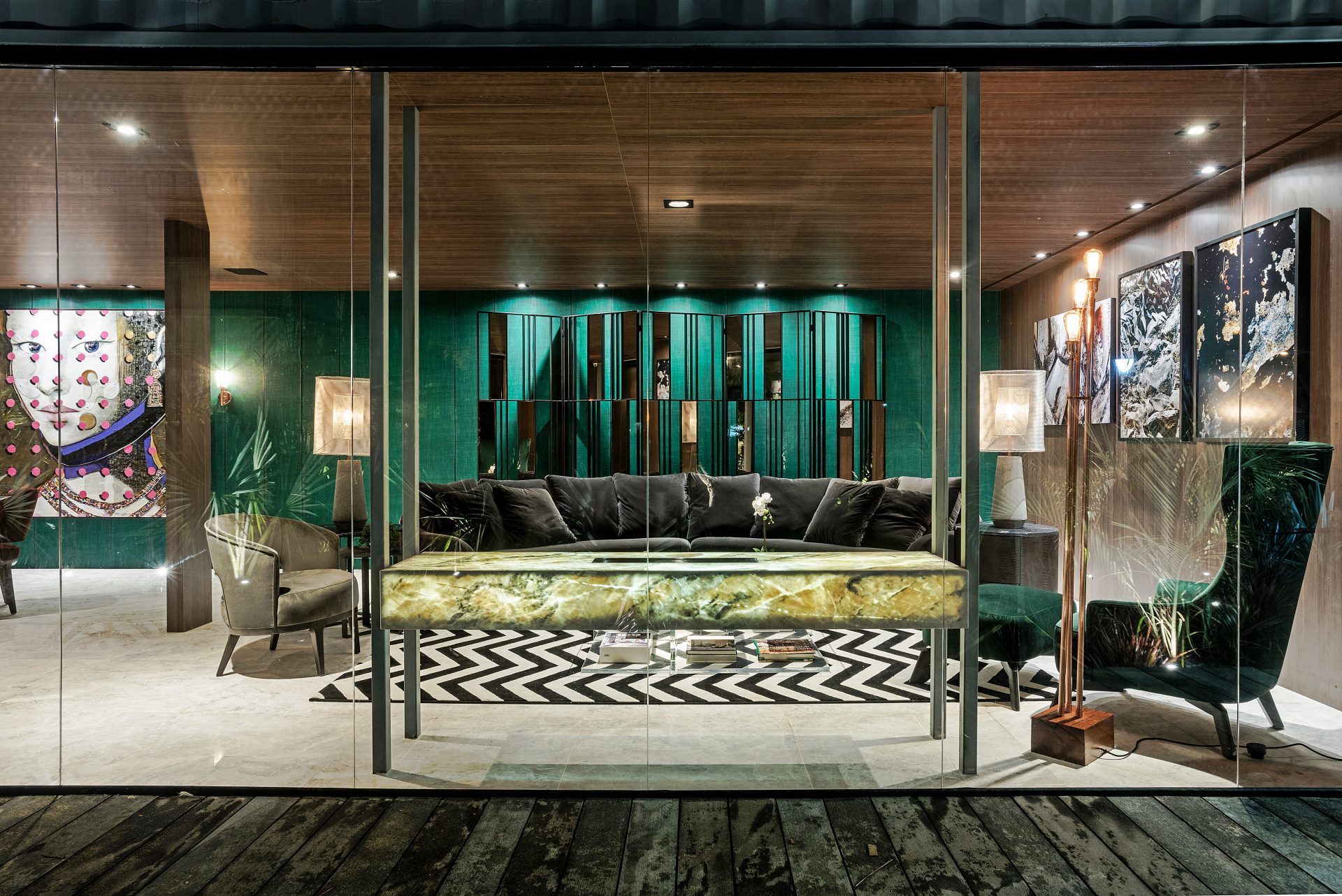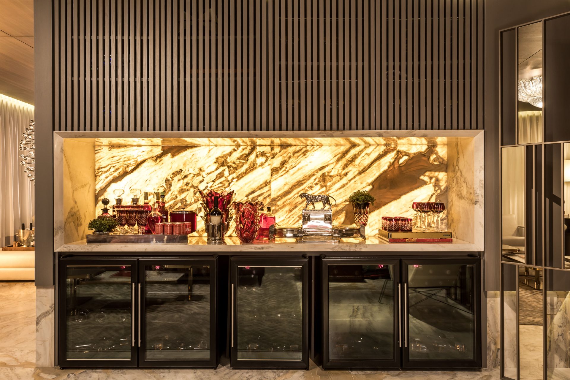 Dependendo da propriedade mineralógica de cada rocha, a Tecnologia Pietrafina® pode proporcionar um efeito translúcido, criando resultados visuais únicos quando combinada com iluminação. A cor da rocha não interfere no processo de corte nem na aplicação da tecnologia, o que varia é a intensidade da translucidez, tornando cada material ainda mais exclusivo.