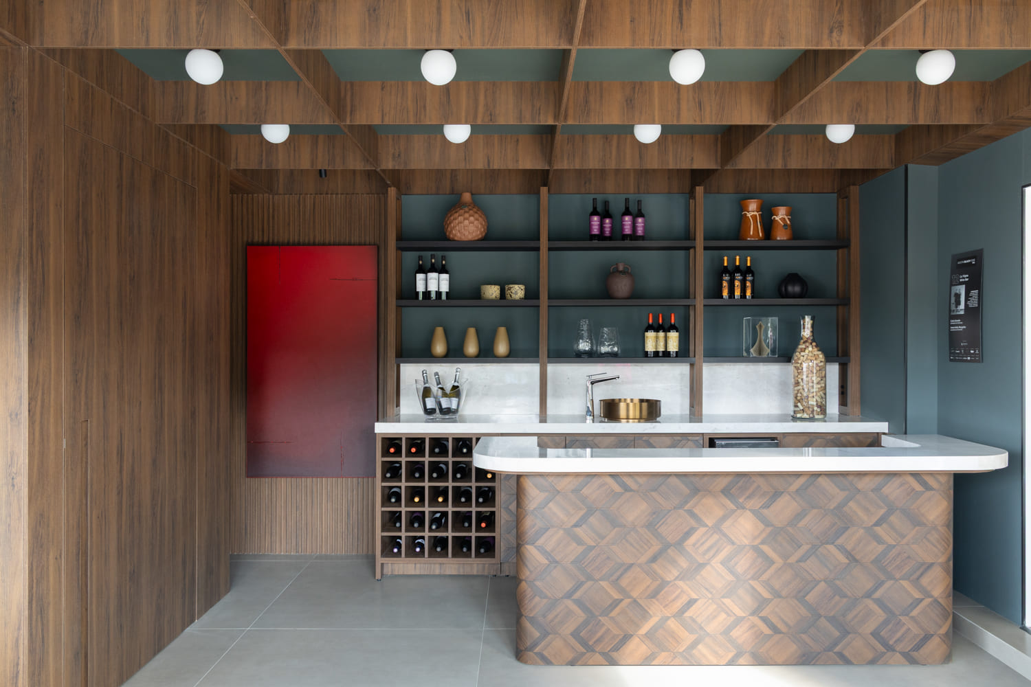 Com o mármore Monte Cristo PR em Pietrafina®, o bar funcional da mostra ganhou um toque de elegância atemporal, integrando acolhimento e experiência sensorial.